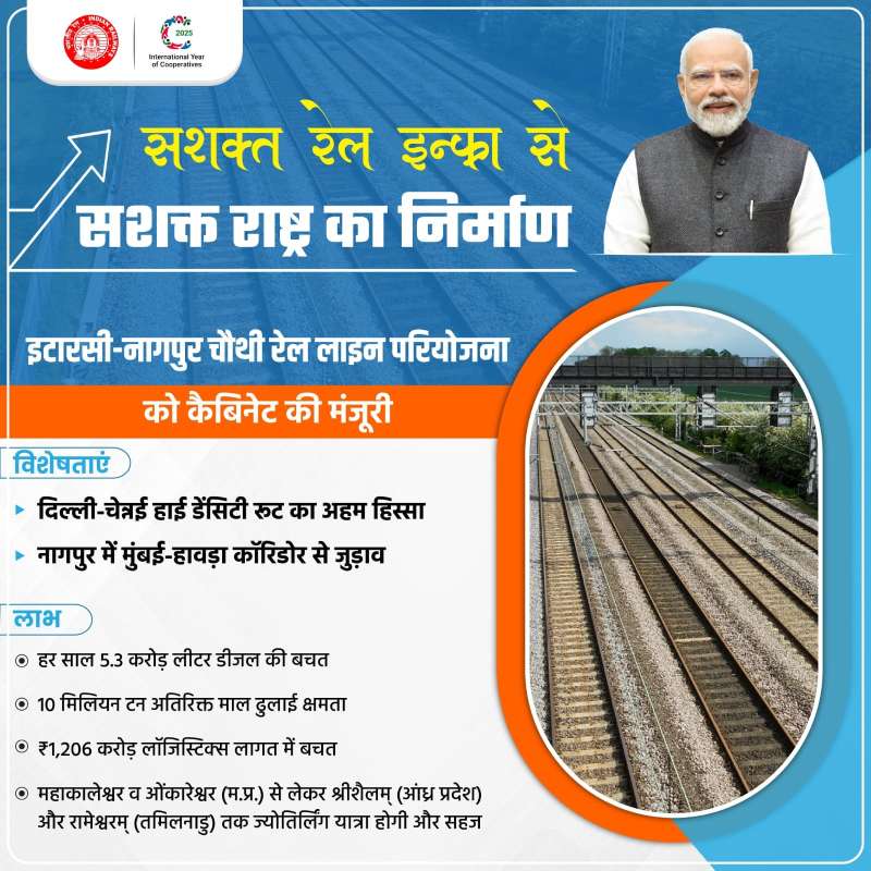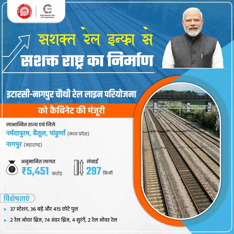 नई दिल्ली/भोपाल 31जुलाई/ इटारसी–नागपुर चौथी रेल लाइन परियोजना को केंद्रीय कैबिनेट की स्वीकृति