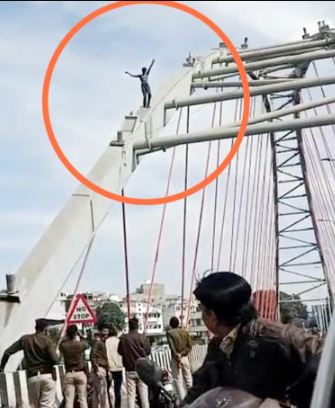 अर्ध नग्न होकर बड़े तालाब पर बने आर्च ब्रिज पर चढ़ गया युवक