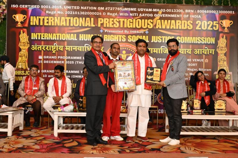 अंतरराष्ट्रीय मानव अधिकार सामाजिक न्याय आयोग (IHRSJC) द्वारा आयोजित अंतरराष्ट्रीय प्रतिष्ठित सम्मान समारोह 2025 का भव्य एवं गरिमामयी आयोजन 25 दिसंबर 2025, गुरुवार को अंतरराष्ट्रीय मानव अधिकार दिवस के शुभ अवसर पर राजस्थान की गुलाबी नगरी जयपुर में संपन्न हुआ। यह आयोजन राज आंगन रिसोर्ट, महाराजा किशन सिंह नगर, सीताराम विहार, पत्रकार कॉलोनी, मानसरोवर, जयपुर में अनुशासित वातावरण में आयोजित किया गया। इस अंतरराष्ट्रीय स्तर के प्रतिष्ठित समारोह में IHRSJC के माननीय राष्ट्रीय गवर्निंग बोर्ड के पदाधिकारी, देश-विदेश की जानी-मानी दिग्गज हस्तियां, जनप्रतिनिधि, वरिष्ठ प्रशासनिक अधिकारी, सेवानिवृत्त आईएएस-आईपीएस अधिकारी, सामाजिक संगठनों के प्रतिनिधि एवं सेलिब्रिटीज़ की उल्लेखनीय उपस्थिति रही।