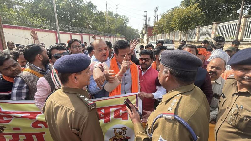 विश्व हिंदू परिषद और बजरंग दल के कार्यकर्ताओं ने शुक्रवार को बाल भवन से नगर निगम कार्यालय तक रैली निकाल कर ग्वालियर में निगम की नाक के नीचे चल रहे अवैध बूचड़खानों पर अनदेखी का विरोध जताया. नारेबाजी करते कार्यकर्ता नगर निगम कार्यालय पहुंचे तो पुलिस ने बेरिकेटिंग के जरिये उन्हें रास्ते में ही रोक लिया. जिस पर हिंदू संगठन और पुलिसकर्मियों में जमकर बहस हुई. इस दौरान हिंदू संगठन के कार्यकर्ताओं ने सड़क पर बैठकर ही हनुमान चालीसा का पाठ कर इस बात का भी विरोध जताया.