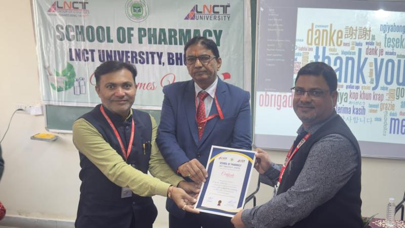 भोपाल। स्कूल ऑफ फार्मेसी, एल.एन.सी.टी. यूनिवर्सिटी, द्वारा बी. फार्मा प्रथम सेमेस्टर के विद्यार्थियों के लिए एक आंतरिक विशेषज्ञ व्याख्यान का आयोजन किया गया। कार्यक्रम के विशेषज्ञ वक्ता डॉ. शैलेश जैन, प्रोफेसर, स्कूल ऑफ फार्मेसी, एलएनसीटी यूनिवर्सिटी, कार्यक्रम का शुभारंभ डॉ. ए. के. सिंघई, निदेशक, स्कूल ऑफ फार्मेसी एवं डीन एकेडमिक्स द्वारा स्वागत भाषण एवं पौधारोपण के साथ किया गया। अपने व्याख्यान में डॉ. शैलेश जैन ने फार्मेसी क्षेत्र में उपलब्ध करियर अवसरों, प्रोफेशनल ग्रोथ एवं अपने अनुभवों को साझा किया, जिससे विद्यार्थी प्रेरित हुए। इस व्याख्यान में संकाय सदस्यों सहित प्रथम सेमेस्टर के विद्यार्थियों ने सहभागिता की और फार्मेसी क्षेत्र की व्यापक संभावनाओं की जानकारी प्राप्त की।