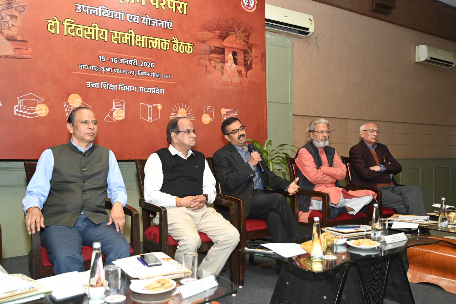दो दिवसीय समीक्षात्मक बैठक में शिक्षा संस्कृति उत्थान न्यास के राष्ट्रीय सचिव अतुल कोठारी, संचालक म.प्र. हिन्दी ग्रंथ अकादमी श्री अशोक कड़ेल, म.प्र. निजी विश्वविद्यालय विनियामक आयोग के अध्यक्ष प्रो. खेमसिंह डहेरिया, संस्कृत विश्वविद्यालय कैथल (हरियाणा) के पूर्व कुलपति डॉ. रमेशचंद्र भारद्वाज, डॉ. मनोज सिंह सहित उच्च शिक्षा विभाग के अतिरिक्त संचालक, प्रधानमंत्री कॉलेज ऑफ एक्सीलेंस, शासकीय महाविद्यालयों के प्राचार्य, शासकीय स्वाशासी महाविद्यालयों के प्राचार्य और महाविद्यालयों में गठित भारतीय ज्ञान परंपरा प्रकोष्ठ के नोडल अधिकारी उपस्थित रहे।